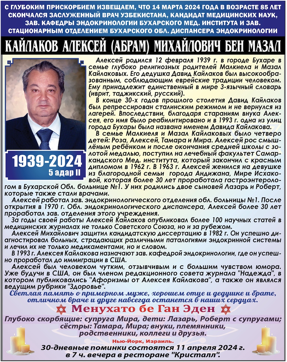 С глубоким прискорбием извещаем, что 14 марта 2024 года в возрасте 85 лет скончался заслуженный врач Узбекистана, кандидат медицинских наук, заведующий кафедрой медицинских Бухарского медицинского института, заведующий стационарным отделением Бухарского областного эндокринологического диспансера Алексей Михайлович Кайлаков (Абрам бен Мазал).